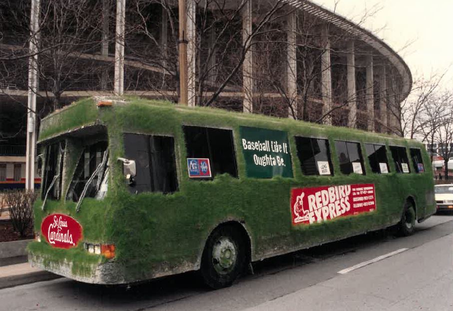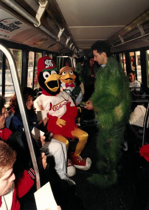 We don’t have all of the information, but we believe this project was launched in part to commemorate the return of grass to the old Busch Stadium in 1996, which was using artificial turf since 1970 – hence the St. Louis Cardinals decal on the front of the bus and an appearance of Fredbird (and Weatherbird!) on the transit system with the artist.